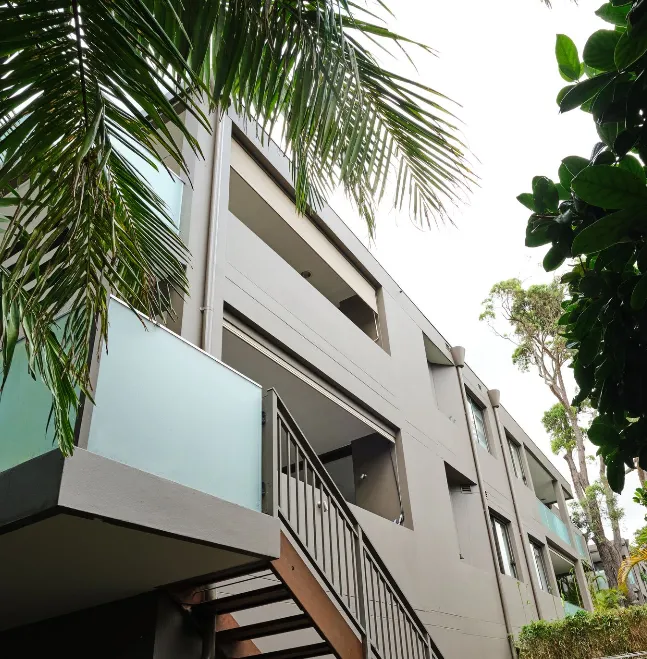 The full project scope covered internal painting to foyer ceilings and walls, alongside external façade repairs and repainting of all previously painted surfaces, including rendered walls, balcony soffits and walkway awnings. Remedial works involved render removal and replacement, as well as replacement of failed flexible sealants.